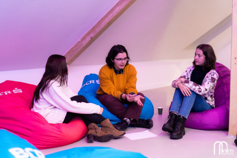 A photo of our Otilia (center) from our national partner in Romania, InIm Institute, delivering a youth mental health workshop.